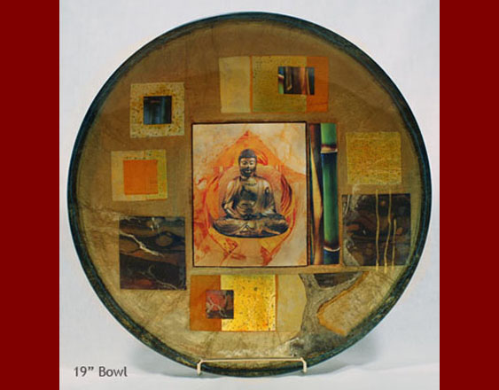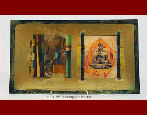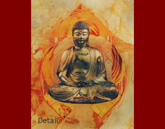 The center of this design is Buddha- Amitabha, the lord of compassion and one of the 5 highest Buddhas. He is elegant as we see him deeply absorbed in meditation. Surrounding him are saffron, citrus orange and bamboo green with teal blues. | ||||||||||||||||||||||||||||
